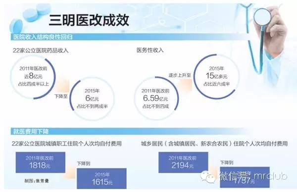 據(jù)統(tǒng)計,三明市22家公立醫(yī)院城鎮(zhèn)職工醫(yī)保住院次均費用由改革前2011年的6553元下降到2015年的5343元;城鄉(xiāng)居民(含城鎮(zhèn)居民、新農(nóng)合農(nóng)民)住院個人次均自付費用由改革前2011年的2194元下降到2015年的1757元。