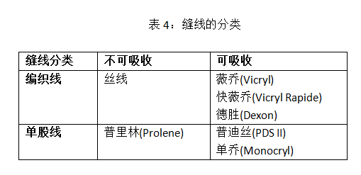 外科縫線按材料可分為不可吸收線和可吸收線兩類。不同縫線的材料如下表所示: