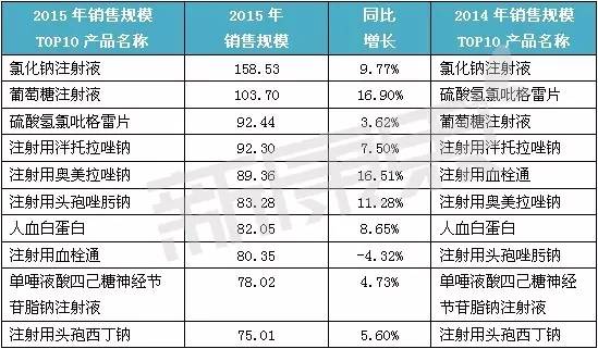 2015年銷售規模最大的藥品前十位除了名次有所改變,基本沒有太大變化。從銷售額增長來看,葡萄糖注射液、注射用奧美拉唑鈉、注射用頭孢唑肟鈉銷售規模漲幅居前,而注射用血栓通、硫酸氫氯吡格雷片、單唾液酸四己糖神經節苷脂鈉注射液增長較慢,甚至出現了負增長。