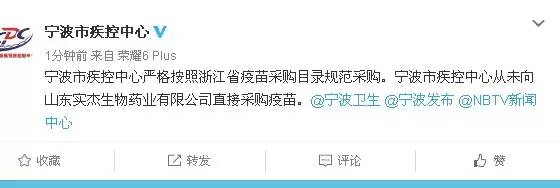 今天10:25左右,@寧波市疾控中心 官方微博再次發表聲明:寧波市疾控中心嚴格按照浙江省疫苗采購目錄規范采購。寧波市疾控中心從未向山東實杰生物藥業有限公司直接采購疫苗。