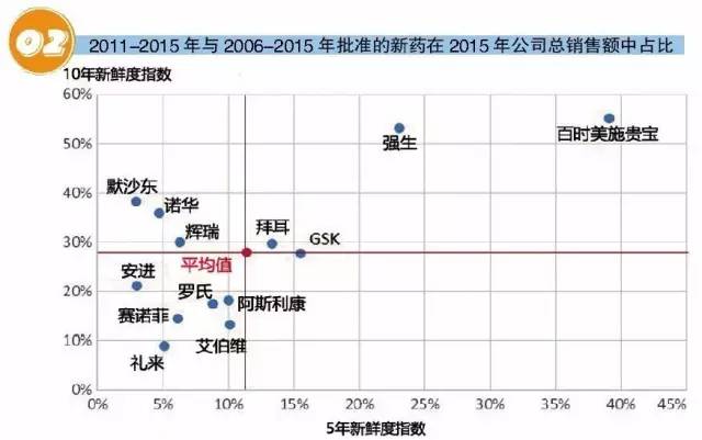● 僅有強生、百時美施貴寶和葛蘭素史克(GlaxoSmithKline)3家藥企銷售額和新鮮度指數超過13家藥企的平均水平,有8家藥企兩項指標均落后于平均水平。