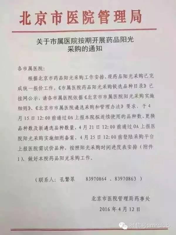 上述文件為北京市醫院管理局昨日的通知,據MRCLUB網友提供另一份北京市醫院管理局今日再發的一份通知顯示,要求各醫院須于本月15日12:00前通過OA上報本院擬連續使用的品種數、更換品種數及新遴選品種數量,4月21日12:00前通過OA上報醫院陽光采購實施細則備案,4月25日12:00前登陸采購平臺上報醫院需議價品種,按照陽光采購進度表安排,做好本院藥品陽光采購工作。