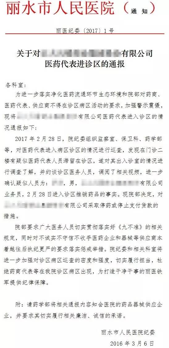 3月6日,浙江麗水市人民醫院紀委發布通告(詳見附件):2月28日,院紀委組織監察室、保衛科、藥學部等,對醫藥代表進入病區診區的情況進行巡查,發現在門診二樓有疑似藥代在診區。