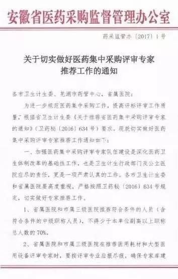 近日,安徽省蕪湖市藥品醫用耗材管理中心發出通知,要求補充推薦醫藥集中采購評審專家,而這一通知則是根據安徽省醫藥采購監督管理辦公室發出的相關文件在蕪湖的落實。