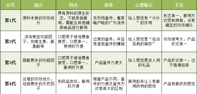 這一代保健食品的代表產(chǎn)品包括:硫酸軟骨素膠囊、葡萄籽膠囊、輔酶Q10片劑等。表1總結(jié)了上述4代產(chǎn)品的特點。
