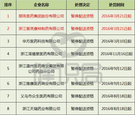 浙江省藥械采購中心發布的《2016年第四季度藥品配送率低于60%配送企業處理結果》,因企業業務調整等原因,自2017年3月21日起暫停麗珠醫藥集團股份有限公司和浙江普洛康裕制藥有限公司自行配送資格。