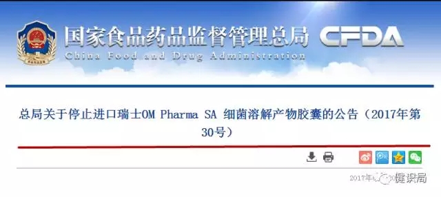 國家食品藥品監督管理總局決定停止瑞士OM Pharma SA的細菌溶解物膠囊進口,要求各口岸食品藥品監督管理局停止瑞士OM Pharma SA細菌溶解物膠囊的進口通關備案。
