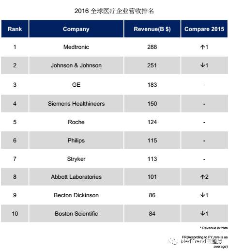 2016年雅培最亮眼的表現莫過于收購,成功收購圣猶達后一舉成為心血管領域第二,賣掉醫療光學部門,甚至差點收購了美艾利爾。雅培也通過收購圣猶達(圣猶達2015年營收約為55億美元排名第九)從2015年醫療行業第十升到2016年的第八。
