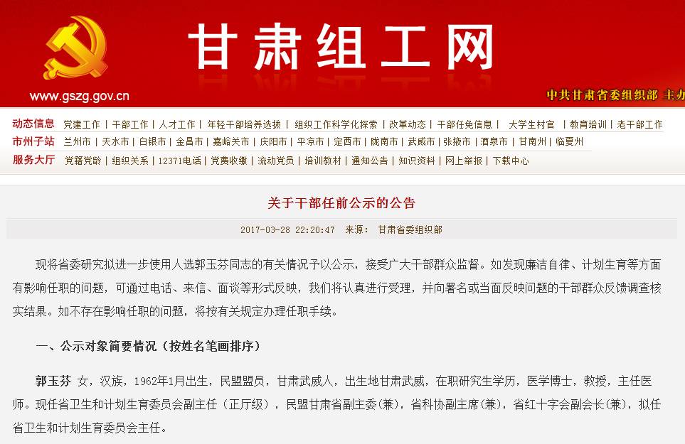 據公開資料顯示,即將接任甘肅省衛計委主任的郭玉芬,出生于1962年,甘肅武威人,現任甘肅省衛計委副主任。郭玉芬曾在醫院任職長達25年,2008年3月赴甘肅省衛生廳任副廳長,5年后任甘肅省衛計委副主任(正廳級),至今已有3年多。