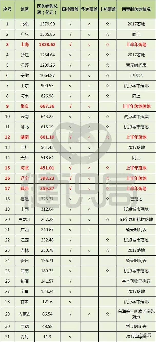 注:各省市區醫藥銷售總額來源于《藥品流通行業運行統計分析報告(2015)》;標注有“√”、“○”、“☆”表明各藥商目前已經在該省/市/區建設了營銷網絡,沒有標注相應符號的省份表面當前該藥商當前商業在該省/市/區尚未建設營銷網絡;打有“×”表明該省為“兩票制”試點省份。加顏色的為上半年落地兩票制的省份。