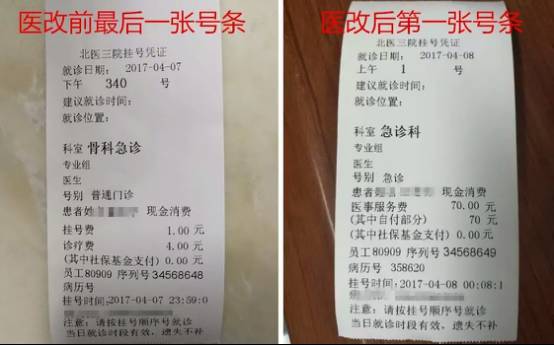 凌晨00:08,北醫三院急診系統開出了第一張號條,新號條上掛號費一項已經消失,取而代之的是醫事服務費,金額為70元,而零點前急診開出的最后一張號條則為:掛號費1元,診療費4元。