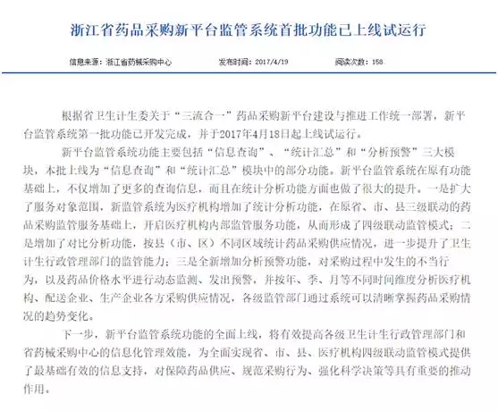 去年11月起,浙江省的省級醫院陸續完成藥品采購平臺的切換,和舊平臺相比,新平臺增加了資金流,醫院和藥品經銷商、藥企的貨款支付直接在平臺上完成,建立30天回款制度,減少藥企的資金壓力。也有利于為藥品采購談判做準備,進一步降低藥價。