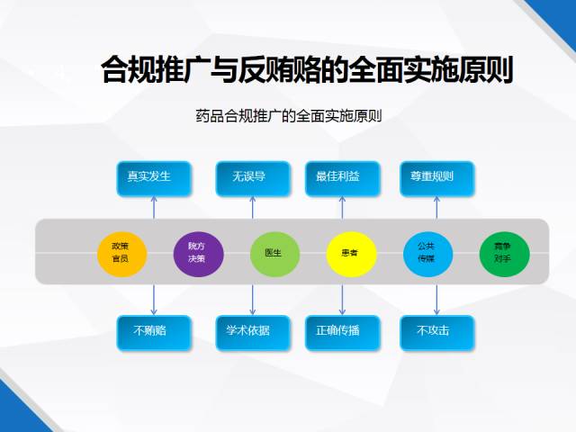 藥品合規推廣的全面實施原則,面向醫院、醫生、政府官員要遵循無誤導、真實發生、學術依據、不賄賂的原則;對患者、公共傳媒、競爭對手要以最佳立意、規則、正確傳播、不攻擊為重。