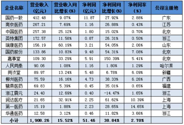 ▍15家區域藥商合計收入不及國控一家