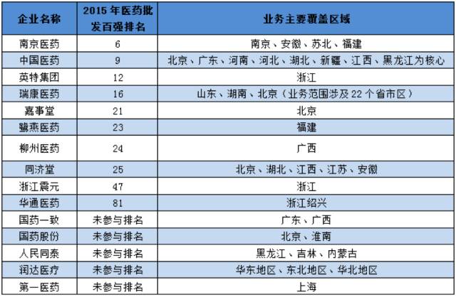 附:15家區域藥商2015年批發百強排名及業務主要覆蓋區域