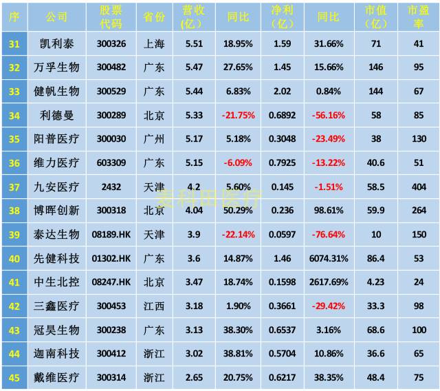 03.凈利潤排行前十位依次為:威高股份、樂普醫(yī)療、愛爾眼科、魚躍醫(yī)療、安圖生物、邁克生物、九強生物、迪安診斷、東富龍、科華生物。其中,8家企業(yè)營收實現(xiàn)同比正增長,2家同比負增長,分別是威高股份和東富龍。