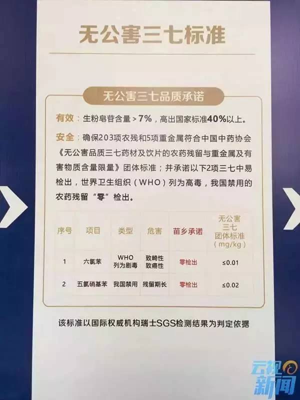 圖為無公害三七標準,該標準以國際權威機構瑞士SGS檢測結果為判定依據