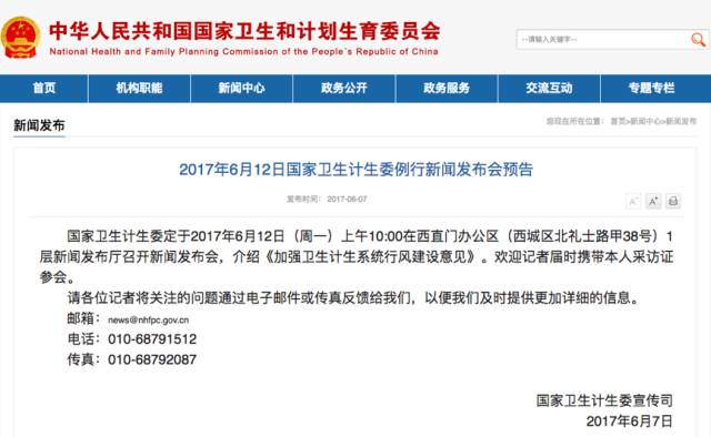 7日,國家衛計委網站預告,將于6月12日(下周一)召開新聞發布會,介紹《加強衛生計生系統行風建設意見》。