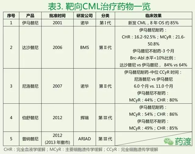 Sprycel (Dasatinib/達沙替尼/施達賽)是一種多靶點酪氨酸激酶抑制劑。2009年5月獲FDA批準,用于治療各期慢性髓細胞白血病(CML)、對包括甲磺酸伊馬替尼在內的治療方案耐藥或不能耐受的慢性髓細胞樣白血病以及費城染色體陽性(Ph+)的急性淋巴細胞白血病(Ph+ALL)。2010年,FDA批準其擴大適應癥,用于治療費城染色體陽性慢性髓細胞白血病(Ph+CP-CML)。目前FDA批準的靶向CML治療藥物包括:伊馬替尼、達沙替尼、尼洛替尼、伯舒替尼和普納替尼,其具體情況如下表所示: