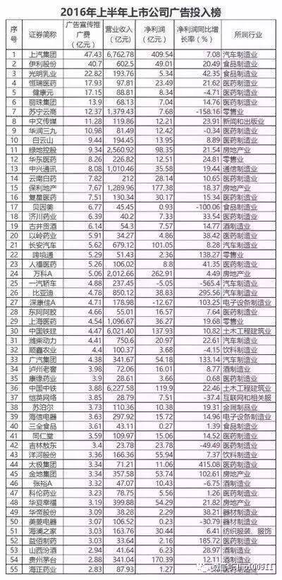 東方財富網此前一組公開數據顯示,在 “2016年上半年上市公司廣告投入榜”上,在廣告投入排名前55位的上市公司中,恒瑞醫藥、健康元、麗珠集團、華潤三九、白云山等19家醫藥企業位列其中。