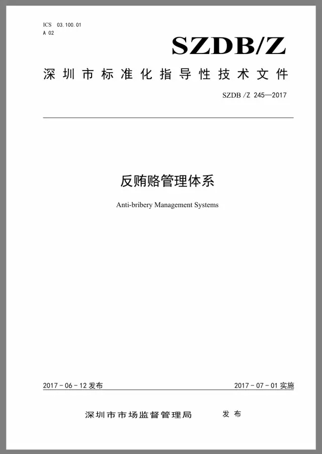 在英國倡導下,國際標準化組織于2013年成立了反賄賂項目委員會,著手研制反賄賂管理體系國際標準,中國為參與成員國,在中央紀委國際合作局的牽頭組織下,深圳市參與了國際標準的研制。2016年10月,ISO37001《反賄賂管理體系要求及使用指南》正式發布。