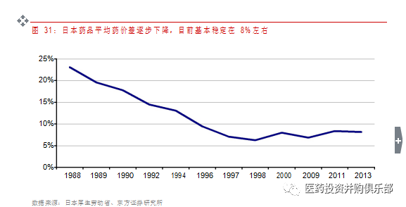 2) 降低藥價(jià),壓低藥品流通環(huán)節(jié)費(fèi)用:日本通過醫(yī)保藥品支付價(jià)格調(diào)整機(jī)制對藥品價(jià)格實(shí)施了卓有成效的管控,其中對于藥品醫(yī)保支付價(jià)格的確定,日本主要采取藥價(jià)基準(zhǔn)制度,即通過定期市場調(diào)查(兩年一次)確定藥品價(jià)格的基準(zhǔn),然后加上一定的合理調(diào)整幅度(由 15%加價(jià)率逐步下調(diào)為目前的 2%)得到調(diào)整后價(jià)格,該價(jià)格即為醫(yī)保支付價(jià)。每次調(diào)整藥價(jià)調(diào)整都導(dǎo)致藥費(fèi)支出呈現(xiàn)下滑,實(shí)現(xiàn)整體藥價(jià)逐步下滑。此外,由于日本政府不對藥品流通價(jià)格不做限制,醫(yī)療機(jī)構(gòu)和藥店基本都會以低于藥品基準(zhǔn)價(jià)的價(jià)格從藥品批發(fā)商中采購藥品,通過結(jié)合藥品消費(fèi)量的加權(quán)平均調(diào)整,日本藥品市場供需雙方的價(jià)差從 1991 年的 23.1%下降至 2013 年的8.2%,目前基本藥價(jià)差基本保持在 8%左右。
