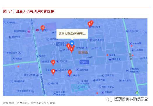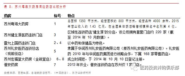 此外,我們對蘇州粵海藥房半徑 3 千米以內(nèi)的藥店進(jìn)行分析,發(fā)現(xiàn)盡管此位置為蘇州最繁華的地段,但附近只有 5 家藥店,且實(shí)力較弱。雷允上藥店以中藥保健品為主,而普安藥房和宏福堂藥房分別于 2013 年和 2014 年才開業(yè),整體實(shí)力偏弱。