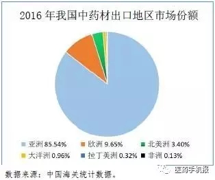我國中藥材出口地區高度集中,亞洲依然是最主要的出口地區。2016年我國對亞洲地區的中藥材出口額約8.77億美元,占我國中藥材出口總額的85.54%。