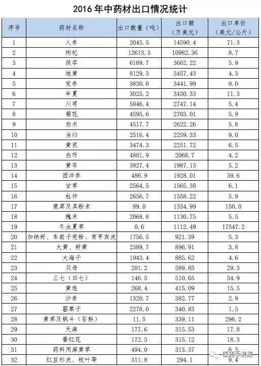 2016年,我國中藥材及飲片出口總額10.25億美元,同比下降3.17%;以人民幣折算,出口總額67.69億人民幣,同比上漲2.97%;中藥材及飲片出口總量14.57萬噸,同比下降18.71%;中藥材及飲片平均出口單價46.43元/公斤,同比上漲26.71%。