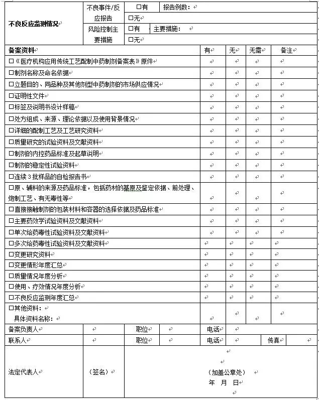 六、醫療機構應通過所在地省級食品藥品監督管理部門備案信息平臺填寫《醫療機構應用傳統工藝配制中藥制劑備案表》(附件),并填報完整備案資料。醫療機構應當對資料真實性負責,并將《醫療機構應用傳統工藝配制中藥制劑備案表》原件報送所在地省級食品藥品監督管理部門。