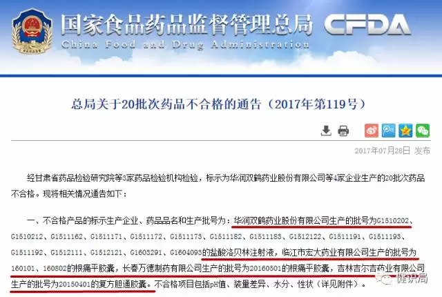 今日(7月28日),國家食藥監總局發布藥品不合格通報,經甘肅省藥品檢驗研究院檢驗,華潤雙鶴藥業股份有限公司(以下簡稱華潤雙鶴)生產鹽酸洛貝林注射液有16批次不合格。臨江市宏大藥業有限公司、長春萬德制藥有限公司、吉林吉爾吉藥業有限公司等藥企共有4批次產品不合格。