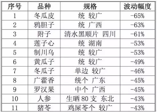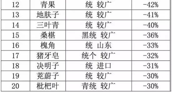 2016年價格跌幅排行前20品種 數據來源:中藥材天地網。