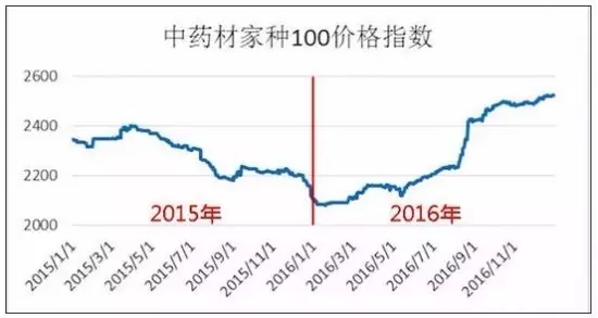 反映家種中藥材價格運行情況的中藥材天地網“中藥材家種100價格指數”(我國具有代表性的100種家種中藥材市場價格的綜合加權)在2016年整體上行,從2100點上行至2500點附近,逆轉了2015年的下行走勢。