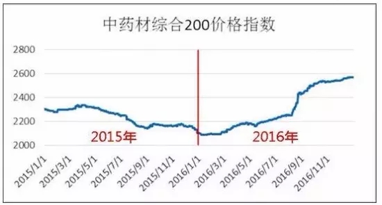 2016年,反映全國中藥材整體價格情況的中藥材天地網“中藥材綜合200價格指數”(我國200種主要大宗中藥材市場價格的綜合加權)整體上行,從2100點左右上漲至2600點附近,與2015年走勢相比,價格明顯回暖。