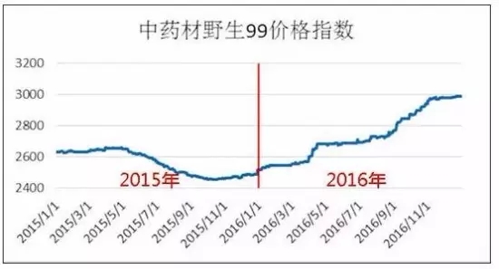 由于野生藥材的資源稀缺性和勞動力價格上漲等原因, 野生中藥材價格總體保持平穩上升態勢。反映野生藥材價格運行情況的中藥材天地網“中藥材野生99價格指數”(我國流通市場中具有代表性的99種野生中藥材市場價格的綜合加權)2015年雖有小幅下滑,2016年該指數從年初的2500點左右上升至3000點附近。