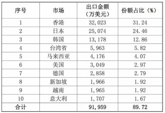 2016年,我國中藥材及飲片的10大出口地區為:中國香港、日本、韓國、中國臺灣、馬來西亞、美國、德國、新加坡、越南、意大利。我國對這10個市場的出口額占全球出口額的90%。這10個市場有7個分布在亞洲,多為傳統出口市場。