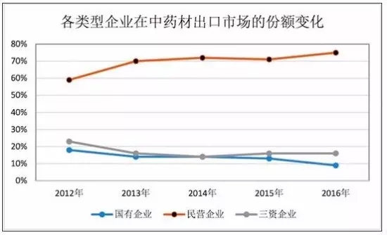 近年來,國有企業在中藥材及飲片出口市場中所占份額逐年下降,民營企業所占份額持續上升。2016年,民營企業市場份額為75%,同比上升4個百分點;國有企業市場份額跌落至9%,同比下降4個百分點;三資企業市場份額為16%, 與2015年基本持平。