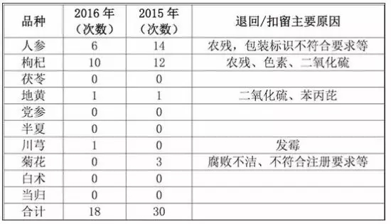 2016年,我國出口藥材整體質量明顯提升。其中,2016年出口額排名前10的品種,因質量等問題被日本、美國、 歐盟、韓國扣留或退回18次,比2015年的30次下降40%。