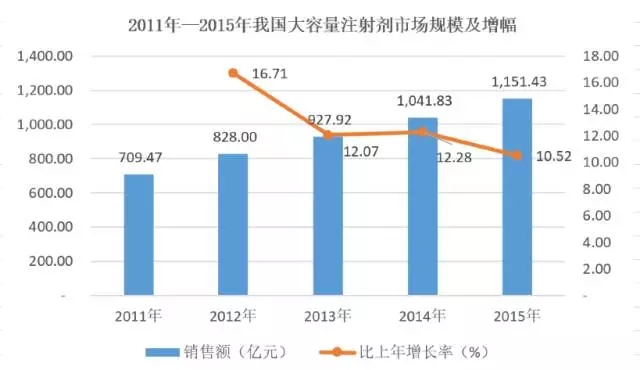 根據(jù)天圣制藥IPO招股書,我國大輸液市場(chǎng)銷售額也由2011年的709.47億元上升至2015年的1,151.43億元,年均復(fù)合增長(zhǎng)率達(dá)到12.87%,2015年及以前增長(zhǎng)還是較為穩(wěn)定的,均在10%以上。筆者預(yù)計(jì)2016年該市場(chǎng)增速在7-8%,市場(chǎng)規(guī)模已經(jīng)超過1200億元。