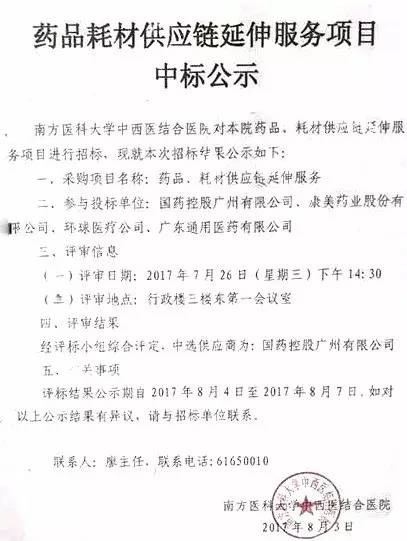近日,業界流傳一份南方醫科大學中西醫結合醫院的《藥品耗材供應鏈延伸服務項目中標公示》。醫院公示:經招投標確定,國藥控股廣州有限公司為該醫院藥品、耗材供應鏈延伸服務的供應商。