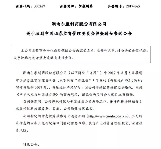 8月9日,爾康制藥發布公告,公司于8月8日收到證監會下發的《調查通知書》,因公司涉嫌信息披露違法違規,根據《中華人民共和國證券法》的有關規定,證監會決定對公司進行立案稽查。