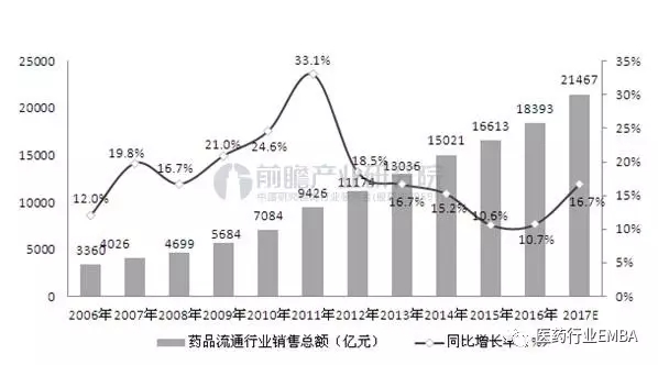 2006-2017年醫藥流通市場規模及增長預測(單位:億元,%)