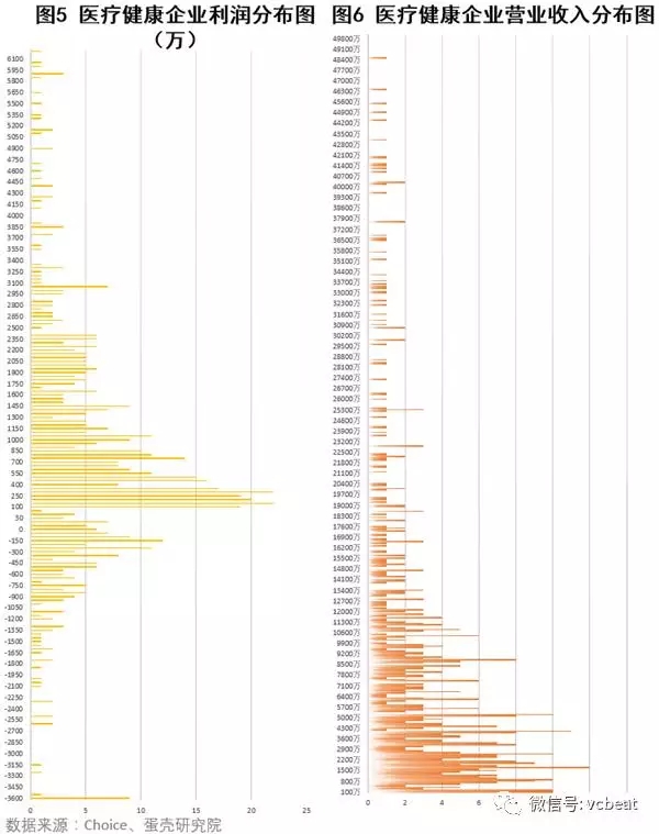我們繪制了新三板醫(yī)療健康企業(yè)營(yíng)業(yè)收入和歸母公司利潤(rùn)分布圖(見(jiàn)圖5、圖6)。