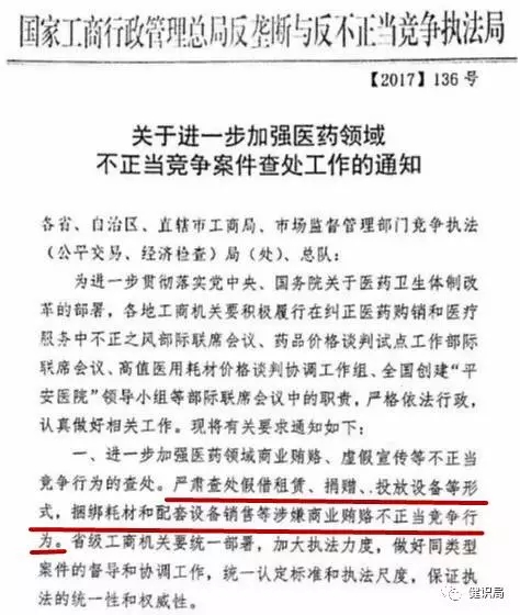 通知顯示, 8月21日,工商總局反壟斷與反不正當競爭執法局印發該通知,通知表示,進一步加強醫藥領域商業賄賂、虛假宣傳等不正當競爭行為的查處,嚴肅查處假借租賃、捐贈、投放設備等形式,捆綁耗材和配套設備銷售等涉嫌商業賄賂不正當競爭行為。