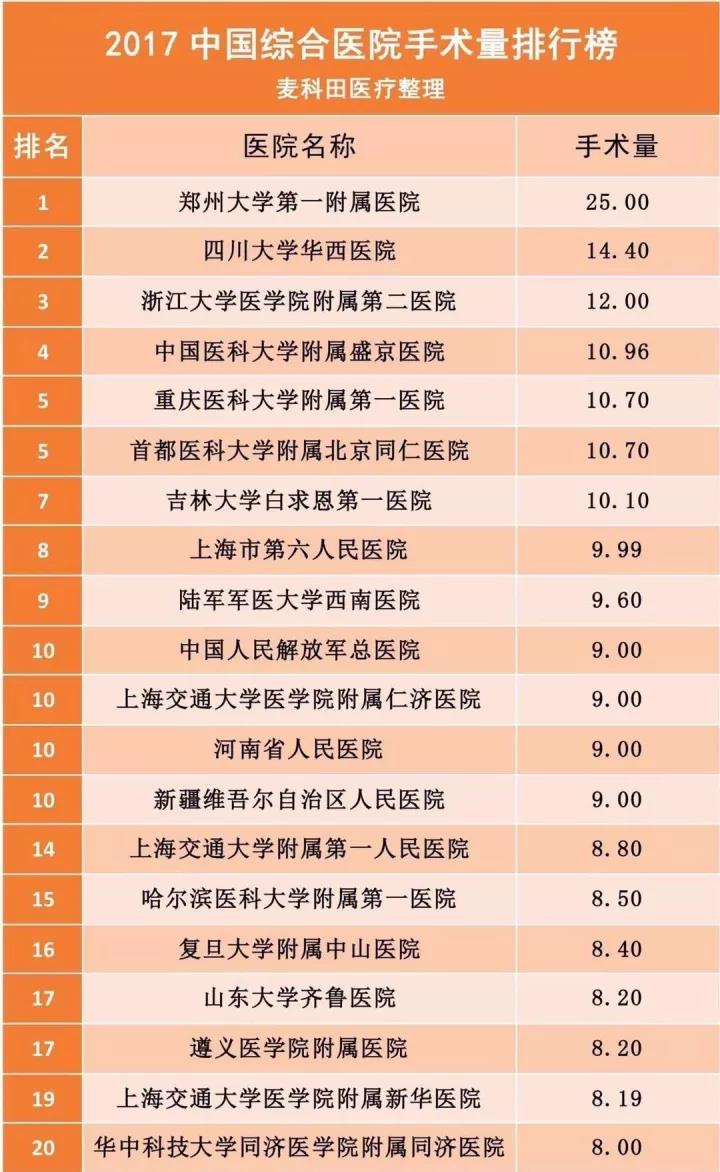 2017中國綜合醫院手術量TOP100排行榜出爐!