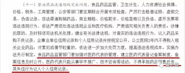 “醫藥代表備案制”首次出現在今年2月,由國務院辦公廳印發的《關于進一步改革完善藥品生產流通使用政策的若干意見》,其中規定:食品藥品監管部門要加強對醫藥代表的管理,建立醫藥代表登記備案制度,備案信息及時公開。醫藥代表只能從事學術推廣、技術咨詢等活動,不得承擔藥品銷售任務,其失信行為記入個人信用記錄。