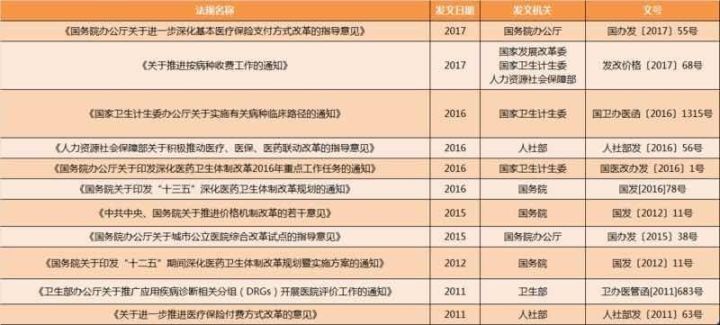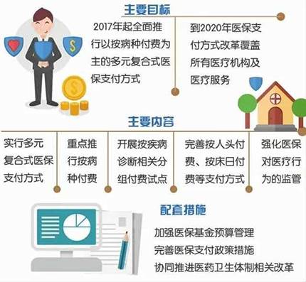 2017年6月, 國辦《關于進一步深化基本醫療保險支付方式改革的指導意見》 明確, 自2017年起, 進一步加強醫保基金預算管理,全面推行以按病種付費為主的多元復合式醫保支付方式。各地要選擇一定數量的病種實施按病種付費,國家選擇部分地區開展按疾病診斷相關分組(DRGs) 付費試點, 鼓勵各地完善按人頭、按床日等多種付費方式。