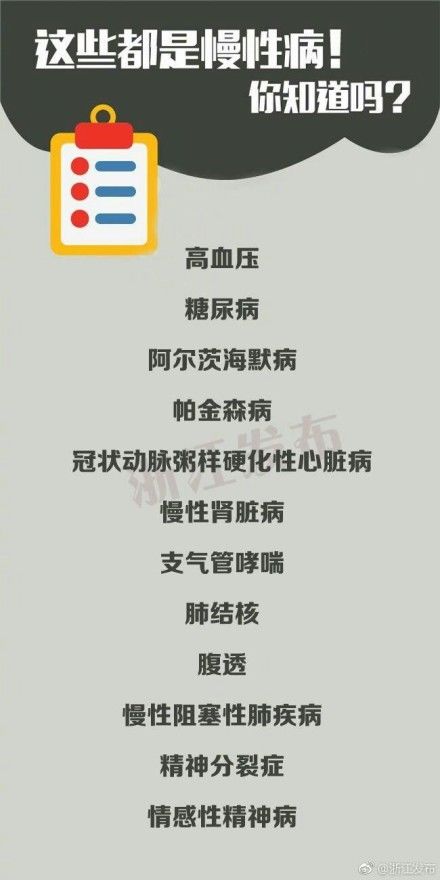 目前,浙江結合本省慢性病疾病譜情況,慢性病特殊(規定)病種暫定為高血壓、糖尿病、阿爾茨海默病、帕金森病、冠狀動脈粥樣硬化性心臟病、慢性腎臟病、支氣管哮喘、肺結核、腹透、慢性阻塞性肺疾病、精神分裂癥、情感性精神病等12種。