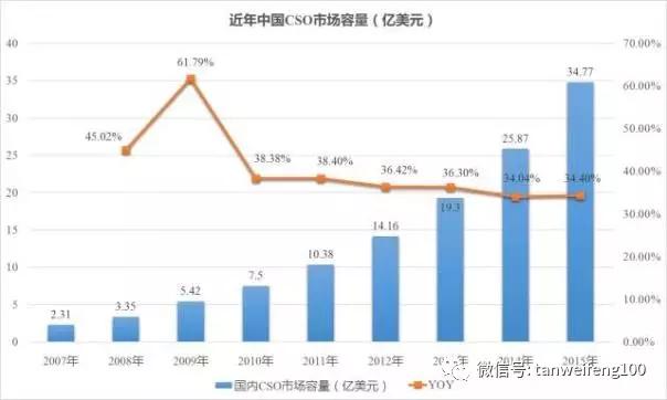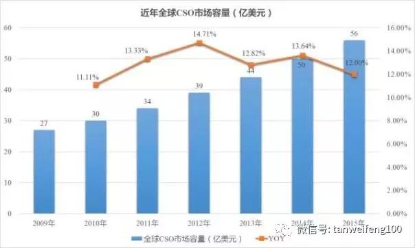 隨著醫藥銷售的“水漲”,CSO市場容量也迅猛增長。根據醫藥經濟報的報道,2009年全球藥品CSO的市場容量大約27億美元,而到2015年則增長至56億美元。從藥企組織醫藥代表,自建銷售隊伍,到CSO的產生,吸引專業醫藥銷售人才,提供綜合、全方位的醫學推廣服務,CSO在全球市場的發展模式已漸趨成熟,且越來越成為藥企歡迎的銷售模式。
