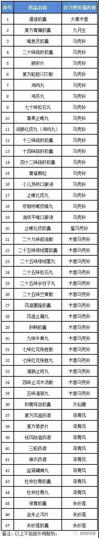 附:含馬兜鈴屬藥材的已上市中成藥品種名單:47種